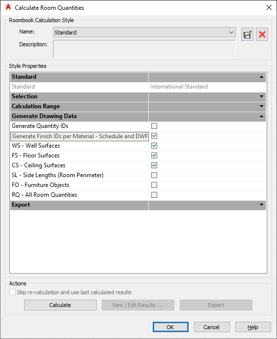- In the Calculate Room Quantities dialog box, under Style Properties, Generate Drawing Data list, select Generate Finish IDs per Material.