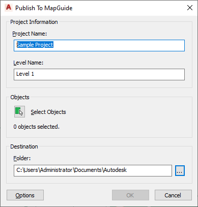 If the drawing from which you want to publish objects is part of a building project, the project name and level assignment of the drawing display in the Publish to MapGuide dialog box.