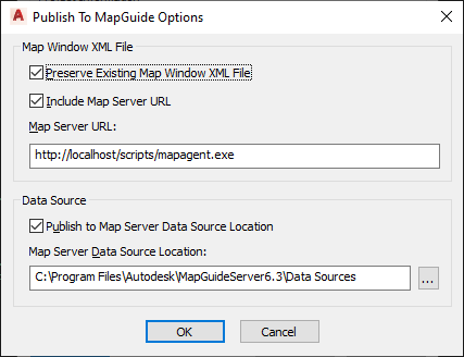 | preserve the existing Map Window XML file | select Preserve Existing Map Window XML file. This option will prevent an existing MWX file in this location from being overwritten. This will allow users to preserve any changes they made to the MWX file (secondary data source table selections, layer properties, or themes) when updating or re-publishing the underlying data or geometry. |