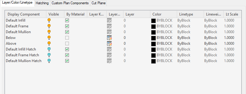 Use this procedure to specify the properties of one or more cut planes for a door/window assembly style. Cut plane display properties apply only to display representations, such as Plan, that are used in Top view (Plan view) of a drawing.