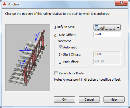 Use this procedure to change the justification of a railing and the side, start, and end offsets. These properties apply only to railings attached to stairs.