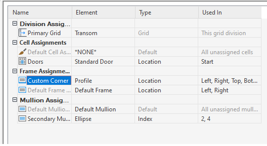 After you have created element definitions for a door/window assembly style, you can assign those definitions to each of the door/window assembly element types: divisions, cell infills, frames, and mullions.