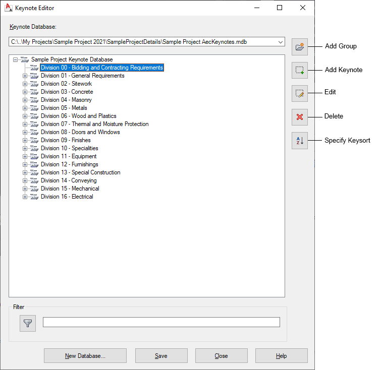 The Keynote Editor is a standalone application that lets you create and modify keynote databases. Accessed from the CAD Manager menu, the Keynote Editor dialog box provides a hierarchical tree view of the currently selected database, which displays as a root node. For an existing database, you can expand the root node to display groups, and then expand group nodes to display sub-groups or individual keynotes. Alternatively, you can enter text into the Filter box below the tree view. Clicking the Filter button, pressing Tab, or pressing Enter expands all nodes under any node whose name includes the text you enter.