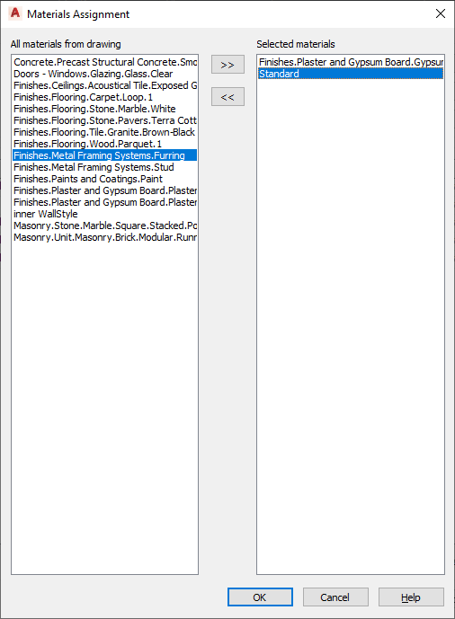 - Lists all AutoCAD defined materials which are available in the drawing.