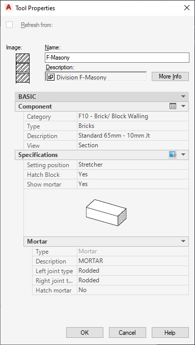The appearance of the Tool Properties worksheet varies depending on the type of component and the current configuration of property settings. The following illustrations show two configurations of the Tool Properties worksheet for the 04 - Masonry tool that is included on the sample Basic tool palette. The tool is set to add standard 3/8” joint brick in both cases, but the first configuration has the View property set to Section, while the second has this property set to Elevation (Pattern). For detail components that can be oriented differently in different views, the View setting determines the particular drawing routine used to insert the image into the drawing. Note that the different View settings result in different orientation illustrations on the worksheet. Note also that the Mortar specifications are not applicable for the Elevation (Pattern) setting and are not displayed for that configuration. The properties displayed under Specifications may also vary depending on other settings. For example, if the Show Mortar property is No when the View setting is Section, no other Mortar properties are displayed. For some detail components, no Specifications apply, and the heading is not displayed.