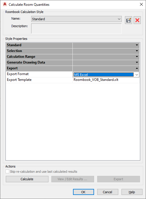 Roombook has predefined MS Excel export forms for each calculation standard which lists all calculated room quantities structured on one sheet.