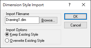 | Import Options | 包括「保留既有型式」,用來保留目前圖面中的標註型式,以及「覆蓋既有型式」,用來在目前圖面中覆蓋型式。「保留既有型式」選項會忽略匯入中具有相類似命名的型式;「覆蓋既有型式」則使用匯入中具有相類似命名的型式。 |