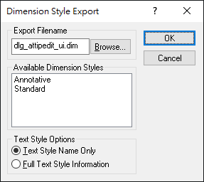 | Available Dimension Styles | 選取標註型式以寫入至 ASCII 檔案。螢幕上會顯示目前的標註型式。會將每個選取的型式寫入至「匯出檔案名稱」群組中所指示的檔案。 |