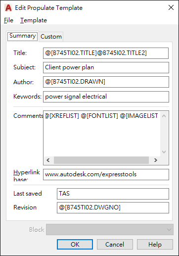 | @[block.attributeTag] | 從帶有屬性的圖塊萃取的屬性標籤值,並將其插入指定的欄位。範例:在「作者」欄位中插入 @[title.drawnby],使 Propulate 在圖面中搜尋帶有屬性的圖塊具名標題、萃取 drawnby 屬性欄位的值,將值插入圖面的「圖面性質」對話方塊「作者」欄位中。如果整個專案都使用通用的圖塊,您就可以輕鬆地更新大量圖面以反映其特定屬性值。 |