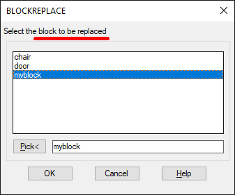 透過在清單中選取或按一下「點選」按鈕,並在圖面中選取圖塊,指定搜尋的圖塊名稱: