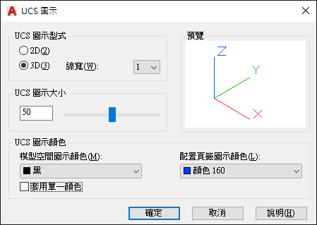 控制在模型空間視埠及配置頁籤中 UCS 圖示的顏色。