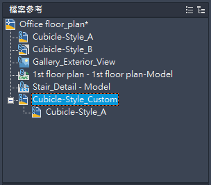 樹狀視圖的頂層永遠展示目前圖面。參考檔案顯示在下一層。可以開啟包含自己的巢狀檔案參考的參考檔案,以展示更深層級。在樹狀視圖中進行選取時,一次只能選取一個檔案參考。