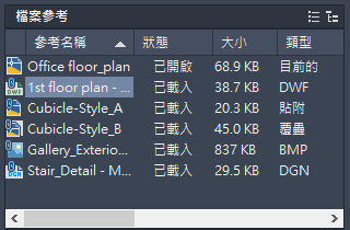 參考名稱欄永遠將目前的圖面顯示為第一個項目,然後以其貼附順序列示其他已貼附檔案。
