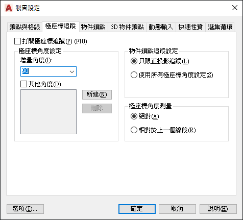 使清單中的其他角度可用於極座標追蹤。(POLARMOD 和 POLARADDANG 系統變數)
