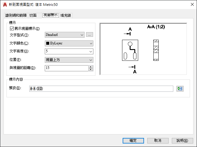 設定剖面視圖標示的文字型式性質、置放和樣式。