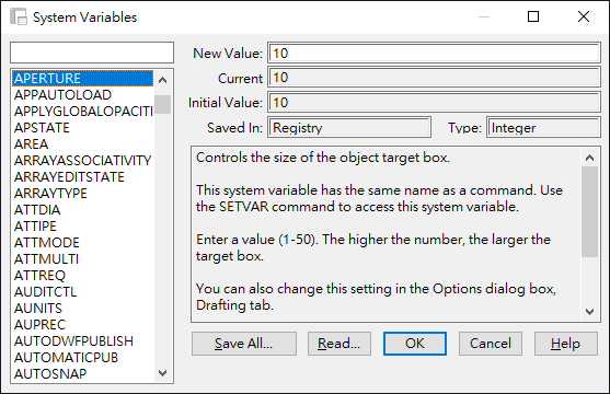 | Initial Value | 顯示亮顯於清單方塊中系統變數的初始值。此即為新圖面中的系統變數值。 |