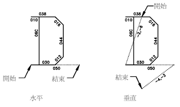 在字元定義中發現此特殊碼時,AutoCAD 會按照方位來決定是繼續處理下一個字碼還是將其略過。如果方位為垂直,則繼續處理下一個字碼;如果是方位為水平,則略過下一個字碼。 在水平文字中,每一個字元的起點都在基準線左端。在垂直文字中,則假設起點是在字元的正上方中央處。在每一個字元結束時,通常都會繪製一個提筆區段,以定位下一個字元的起點。如果是水平文字,該提筆區段繪製在右側;如果是垂直文字,則繪製在下方。特殊碼 00E (14) 主要用於調整起點差異與終點差異,可讓相同的字元造型定義既可用於水平方位,也可用於垂直方位。譬如,下列大寫 D 的定義既可以用於水平文字又可用於垂直文字。 *68,22,ucd 2,14,8,(-2, 6),1,030,012,044,016,038,2,010,1,06C,2,050, 14,8,(-4,-3),0 ![]() |