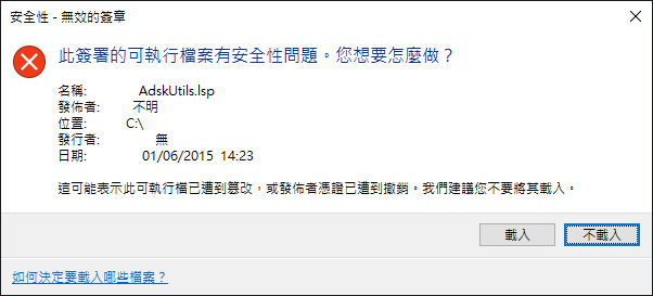 當載入已數位簽署的自訂程式檔時,AutoCAD 系列程式會確認數位簽章是否已貼附至檔案。顯示的訊息方塊會指示數位簽章是否可驗證,以便使用者決定是否要將程式檔載入圖面環境。