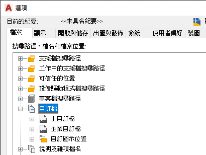 - 在「選項」對話方塊的「檔案」頁籤中,按一下「自訂檔」節點旁的加號 (+) 以將其展開。