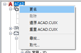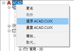 註: 在重置時,只有在程式安裝位置下方 UserDataCache 資料夾中找到的 CUIx 檔中可進行重置。