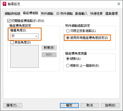 您也可以使用 F3 快速鍵開啟和關閉「物件鎖點」,使用 F11 快速鍵開啟和關閉「物件鎖點追蹤」,使用 F10 快速鍵開啟和關閉「極座標追蹤」。