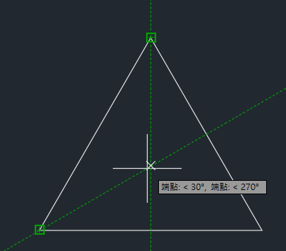 物件鎖點追蹤預設只以正交方式追蹤。但是,您可以變更「物件鎖點追蹤」設定,以使用所有極座標角度設定。假設這次您要使用物件鎖點追蹤在此三角形的中心點繪製一個圓。