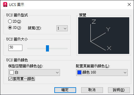 | UCSICON | 控制 UCS 圖示的可見性和位置。 | 3 | 圖面 |