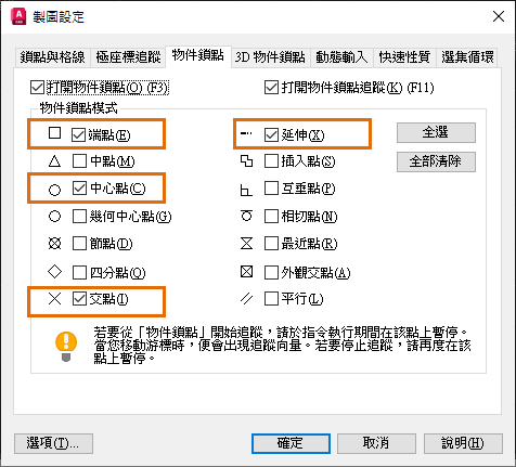 例如,OSMODE 系統變數可讓您設定多個常駐式物件鎖點 (物件鎖點)。以下是可用的選項: