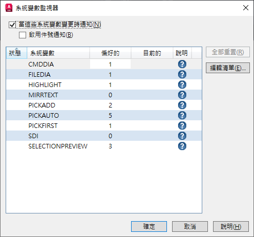 在指令提示下,輸入 SYSVARMONITOR。在「系統變數監視器」對話方塊中,可以查看目前正受到監控的系統變數。