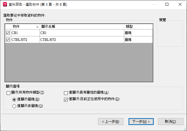 - 清除「顯示所有物件類型」勾選方塊,然後選擇「僅顯示圖塊」,然後按一下「下一步」繼續。