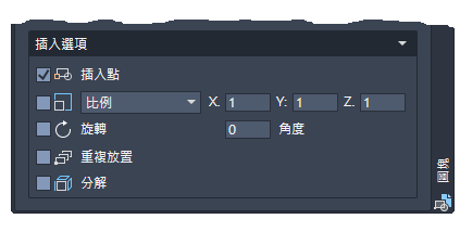 提示: 您通常可以接受「圖塊」選項板底部的預設選項,但是可以實驗這些選項,看看您要使用哪些選項。