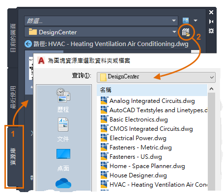 - 若要從「設計中心」資料夾中選擇其他資源庫圖面,請確保目前的頁籤是「資源庫」頁籤 (1),然後按一下檔案導覽按鈕 (2)。