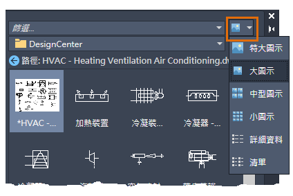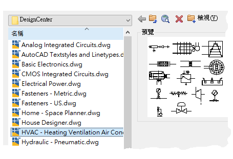 「設計中心」資料夾中的每個圖面都包含一組相關的圖塊定義。