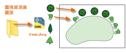 - 某個圖檔內含的一個或多個圖塊定義。例如,您可以建立只包含樹的圖塊定義的圖面。然後,您可以將該圖面中的任何這些圖塊插入到目前圖面中。包含相關圖塊族群的圖檔通常稱為圖塊資源庫圖面。