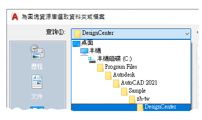 - 導覽至儲存各種範例圖面的「設計中心」資料夾。