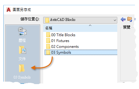 提示: 當您儲存圖面以便之後插入時,請瀏覽至某個資料夾,按一下滑鼠右鍵,然後建立幾個資料夾以組織圖面。您可以將一個或多個資料夾拖曳到「位置」列中,以後就能夠更容易存取。
