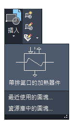 - 從「常用」頁籤按一下「插入」,然後按一下「資源庫中的圖塊」。這會啟動 BLOCKSPALETTE 指令。