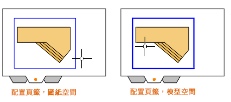 當您在配置頁籤上工作時,可以切換圖紙空間與模型空間,而不需要返回「模型」頁籤。以下是作法。如圖所示,您移動游標並在配置視埠內部按兩下來存取模型空間,或在配置視埠外部按兩下來返回圖紙空間。當您位於模型空間時,配置視埠的邊框會變更厚。