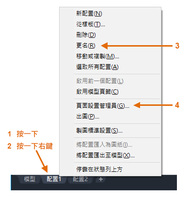 當您要存取配置頁籤時應做的第一件事,是 (1) 在配置頁籤上按一下右鍵,並 (2) 將其更名成 (3) 比「配置 1」更具體的名稱。參考特定 ANSI 或 ISO 大小的名稱可能是不錯的選擇。