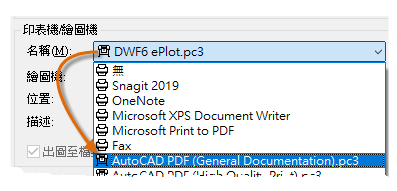 在「印表機/繪圖機」下拉式清單中,選擇 AutoCAD PDF (一般文件).pc3: