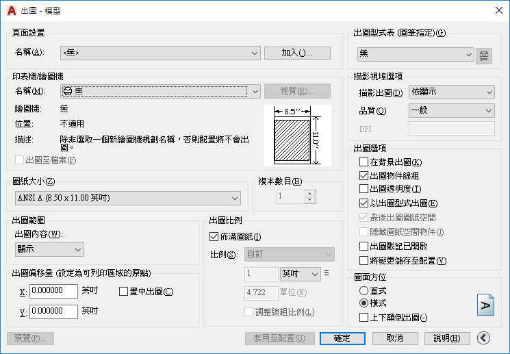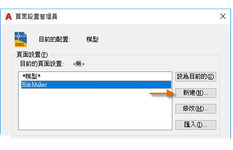 若要建立新頁面設置,請按一下「新建」並輸入新頁面設置的名稱。然後會顯示一個類似於「出圖」對話方塊的「頁面設置」對話方塊。選擇所有要儲存的選項和設定。