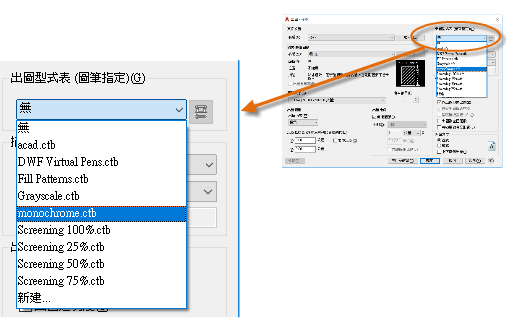出圖型式表可提供有關處理顏色的資訊。在顯示器上正常顯示的顏色可能不適用於 PDF 檔或列印。例如,您可能想要建立單色輸出的彩色圖面。以下是指定單色輸出的方法: