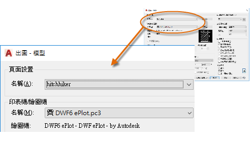 當準備出圖時,您只需在「出圖」對話方塊指定頁面設置的名稱,然後所有出圖設定將會還原。在以下插圖中,「出圖」對話方塊設定為使用 Hitchhiker 頁面設置,而這會輸出 DWF (Design Web Format) 檔,而不是列印至繪圖機。