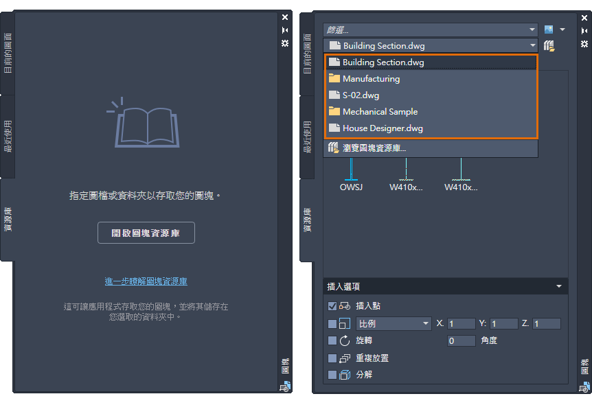 「圖塊」選項板已增強,可讓您隨時隨地更方便地存取圖塊。