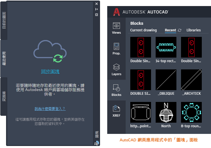 使用您的 Autodesk 帳戶搭配使用支援的雲端儲存服務提供者 (Box、Dropbox 或 Microsoft OneDrive),即可快速並隨時隨地存取您最近使用的圖塊和圖塊資源庫圖面。