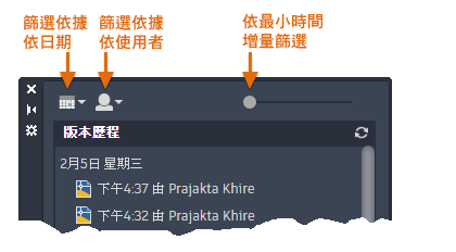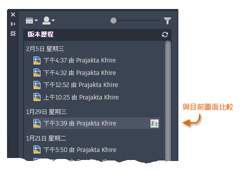 在新「圖面歷程」選項板中檢視儲存在雲端的圖面版本歷程,您可以在其中將這些版本與目前版本的圖面進行比較。