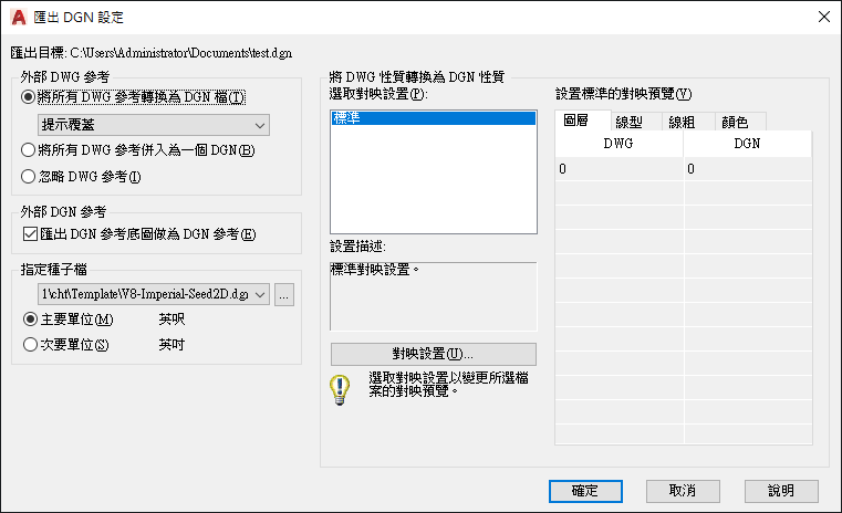 標準為預設對映設置,其從正匯出的圖面中萃取資料並將自動對映套用至 DGN 圖層、線型、線粗和顏色,如對映預覽所示。