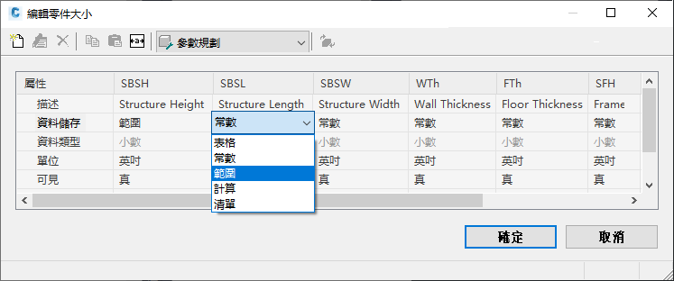 使用此程序可以向模型加入個別零件大小。您可以透過加入參數值來建立個別零件大小。這些值可以是值的清單或表格、常數值或計算值。