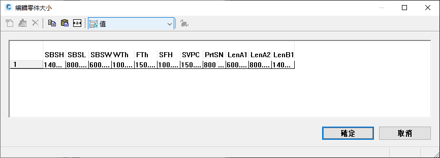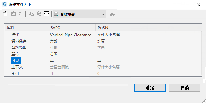 - 若要加入零件的新大小,請按一下參數值,然後按一下工具列上的「編輯」。