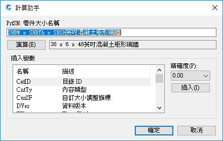 將顯示與參數值關聯的計算字串。例如,結構的「零件大小名稱」(PrtSN) 的計算公式可能為「SHBW x SHBTh x SBSH 英吋混凝土矩形端牆」。而對於管,公式可能為 FormatNumber($PID,0) +「英吋混凝土管」。